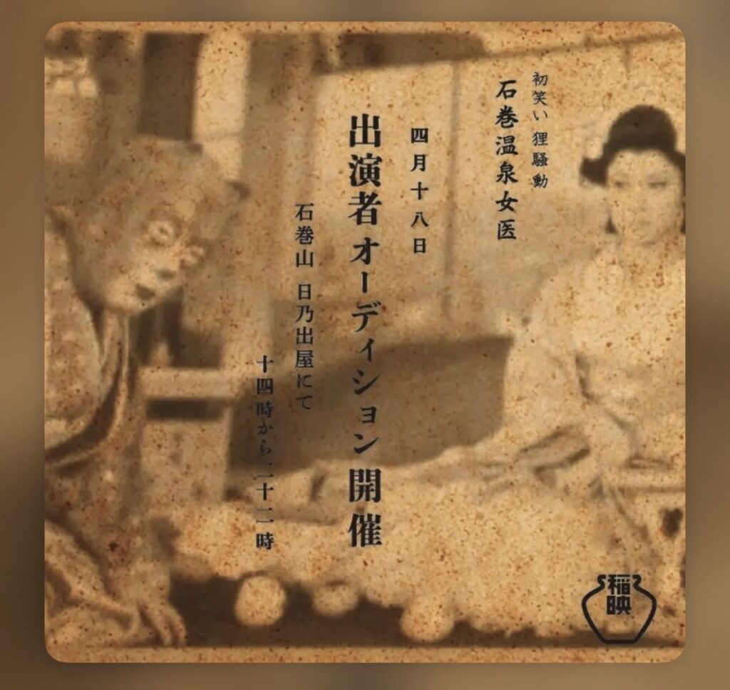 HOMEかわら版石巻温泉女医 2026 年4月18日土曜日 14時から22時 令和9年春公開予定映画 「初笑い 狸騒動 石巻温泉女医」の出演者オーディション第二弾を撮影舞台”石巻山 日乃出屋”にて開催します 撮影が8月末からスタートしますので、ほぼ配役が決まるオーディションです。前回ご参加いただいた方も新規の方もどしどしご参加お待ち申し上げております。 時間内なら飛び込みオッケーです。 もし時間外をご希望の場合はご一報ください。 午前中でも対応可能です。もちろん23時でも。 詳しくは・・ 稲映始動 映画製作協賛金募集